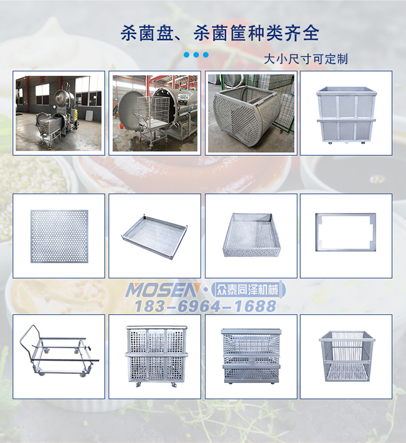殺菌鍋由鍋體、鍋蓋、開啟裝置、鎖緊楔塊、聯鎖裝置、軌道、滅菌筐、蒸汽噴管及若干管口等組成。鍋蓋密封采用充氣式硅橡膠耐溫密封圈,密封可靠,使用壽命長。具有受熱面積大,熱效率高、加熱均勻、液料沸騰時間短、加熱溫度容易控制等特點。殺菌鍋是利用飽和蒸汽或高溫熱水對食品罐頭進行熱處理的壓力容器。在工業生產上,把需要殺菌的食品罐頭放入殺菌鍋內,通過一定時間持續而均勻的高溫作用,可殺死食品物中的微生物,破壞生物酶并對耐熱孢子的活力起到滅殺作用,達到商業無菌,從而大大延長罐頭的貨架期,使之在常溫下保存一定時間而不致敗壞。