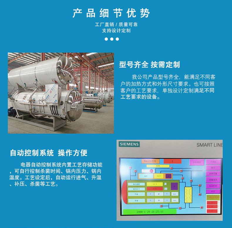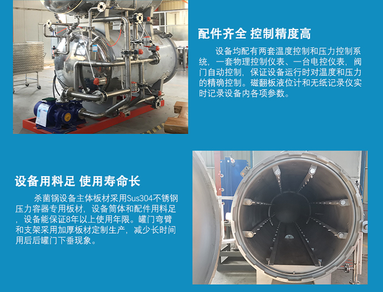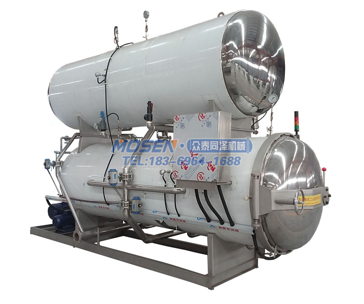 多種罐體結構,多種加熱方式,可根據需求定制。殺菌鍋按控制方式分為手動,半自動,全自動;按鍋體材質分為不銹鋼和碳鋼兩種。溫度,時間,壓力自動控制,操作簡單方便,耗能低。在殺菌過程中使用的工作介質可循環使用,節省了能源、時間及人力、物力的消耗,降低了生產成本。高溫短時間滅菌采用雙罐熱水循環進行殺菌,事先將熱水罐內的水加熱到滅菌所要求的溫度,從而縮短了滅菌時間,提高了工作效率。當產品進入殺菌鍋,殺菌鍋門被關閉和鎖緊的時候,開始殺菌。這種預先編程的過程循環有如下階段組成:
