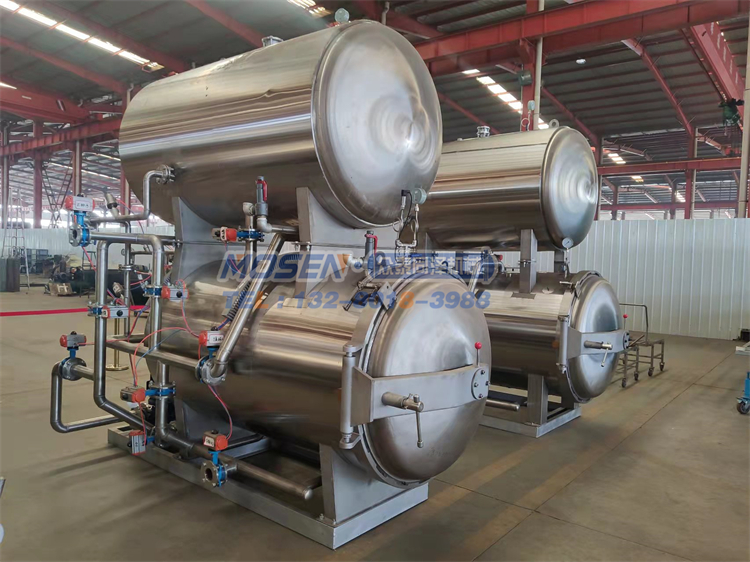 水浴式殺菌:通過直接注入蒸汽,使熱水罐的水升溫到預(yù)定溫度,然后注入到殺菌鍋內(nèi),殺菌鍋內(nèi)食品全部被熱水浸泡,并通過壓力和水泵促進(jìn)循環(huán),